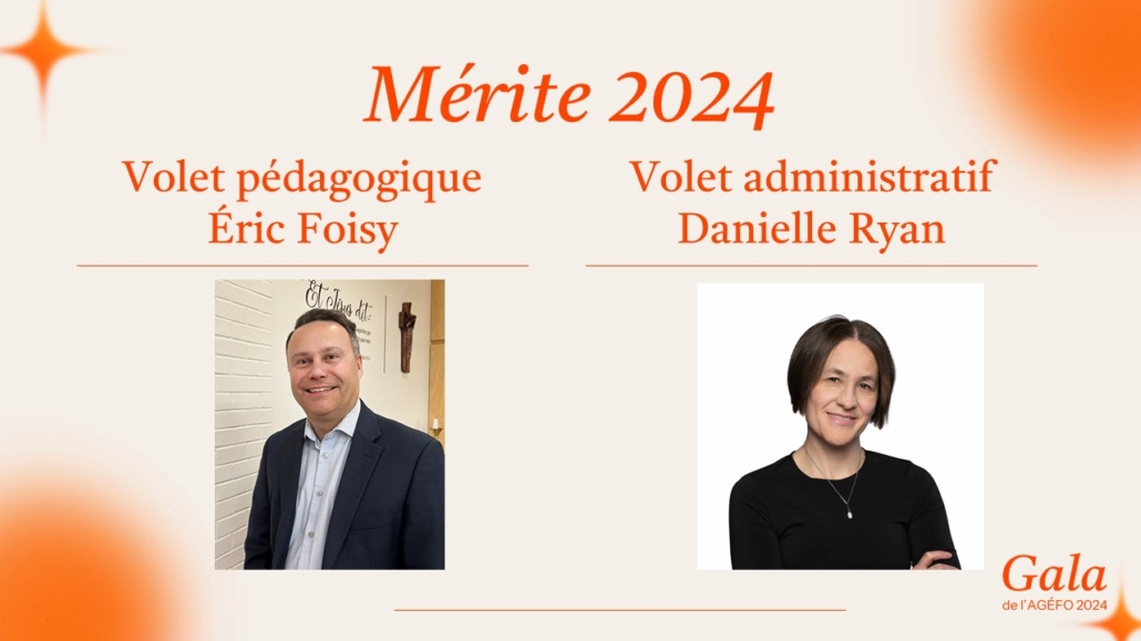 Le Mérite de l’AGÉFO est une décoration que décerne annuellement l’AGÉFO à une personne pour chacun des volets : pédagogique et administratif qui ont fait, au cours de leur carrière, une contribution exceptionnelle à l’éducation franco-ontarienne ou à l’AGÉFO.